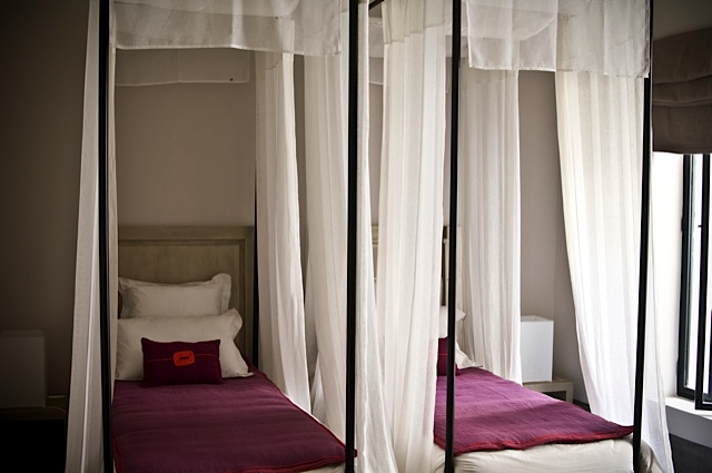 Située au 1er étage, la Suite CHAPITRE 2, très spacieuse, est composée de 2 lits de 90 à BALDAQUIN aux voilages de coton blanc qui lui donne un petit air romantique avec ses murs gris perle mais la couleur fuchsia des coussins et courtepointes vient rehausser le tout.