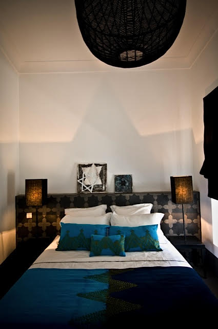 Située au 1er étage, la chambre CHAPITRE 4, noire et blanche est réveillée par son jeté de lit et les lumineux coussins turquoises.